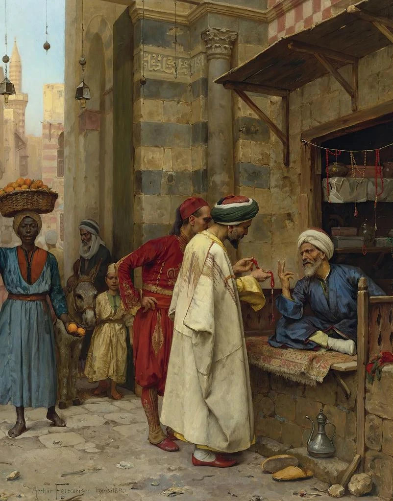 La Reproduction Conduire une affaire au Caire - Arthur von Ferraris – Introduzione coinvolgente Nell'universo affascinante dell'arte, alcune opere riescono a catturare l'essenza di un'epoca e di un luogo con tale intensità da diventare finestre aperte sul passato. "Conduire une affaire au Caire - Arthur von Ferraris" ne è un esempio perfetto, immergendoci in un Cairo vibrante e animato, dove gli scambi commerciali e le interazioni umane tessono un racconto ricco di colori ed emozioni. Quest'opera, al tempo stesso narrativa e visiva, trasporta lo spettatore in un viaggio sensoriale nel cuore dell'Egitto, paese carico di storia e mistero. Attraverso questa tela, l'artista ci invita a esplorare le dinamiche sociali e culturali di una città in piena effervescenza, facendoci percepire l'energia palpabile delle sue viuzze. Stile e unicità dell’opera Lo stile di Arthur von Ferraris si distingue per un'attenzione meticolosa ai dettagli e una palette di colori accuratamente selezionata. In "Conduire une affaire au Caire", riesce a catturare non solo i volti dei personaggi, ma anche l'atmosfera unica del luogo. I giochi di luce e ombra, così come le texture dei tessuti e dei materiali, conferiscono alla scena una profondità sorprendente. L'artista utilizza tecniche di pittura che evocano sia il realismo che una certa poesia, creando così un'atmosfera immersiva. Ogni personaggio sembra vivo, impegnato in una transazione o in una conversazione, e ognuno racconta una storia. Questa tela non si limita a essere una rappresentazione visiva; è un invito a comprendere le sottigliezze delle relazioni umane e commerciali in un contesto storico ricco. L’artista e la sua influenza Arthur von Ferraris, nato nel XIX secolo, è un artista il cui lavoro si inscrive nel movimento orientalista, che ha conosciuto un grande sviluppo in quel periodo. La sua opera riflette una fascinazione per le culture esotiche e i paesaggi lontani, spesso idealizzati attraverso il prisma dell’Occidente. Ferraris, come osservatore attento, ha saputo tradurre questa fascinazione in composizioni vibranti, testimonianza della sua abilità nel coniugare tecnica ed emozione. La sua influenza si estende oltre le sue creazioni, ispirando altri artisti a esplorare i temi dell’Oriente e a catturare la bellezza delle culture diverse.