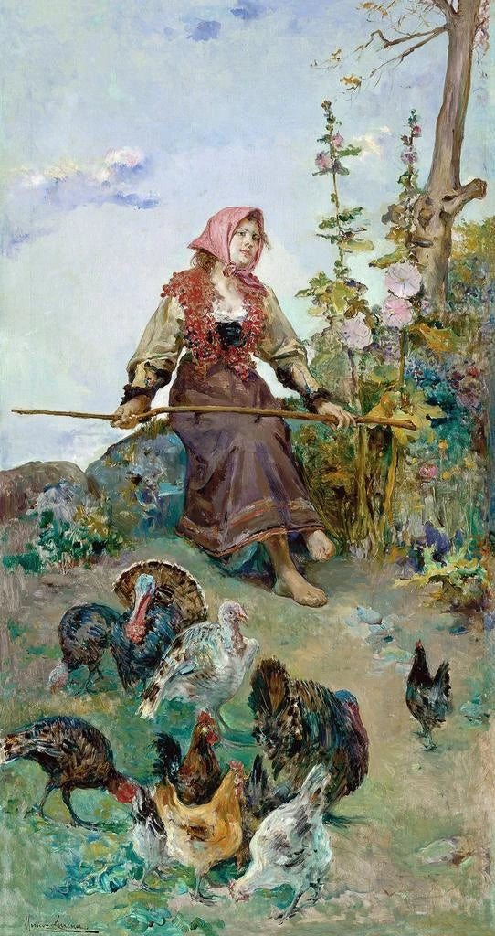 Dans "Soins aux dindons", Tomás Muñoz Lucena nous plonge dans un univers pastoral où la nature et les animaux cohabitent harmonieusement. La toile déploie une palette de couleurs douces, dominée par des verts apaisants et des touches de jaune éclatant, évoquant la lumière d'un jour ensoleillé. La technique de l'artiste, mêlant réalisme et impressionnisme, permet de ressentir la chaleur de la scène, comme si l'on pouvait entendre le chant des oiseaux et le bruissement des feuilles. Les dindons, représentés avec soin, semblent presque vivants, ajoutant une dimension tactile à cette œuvre qui invite à la contemplation.