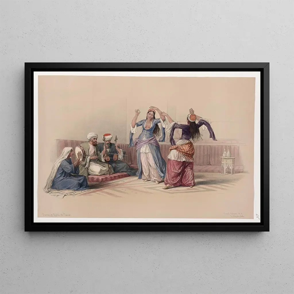 "Danseuses al Cairo" di David Roberts è un'opera che evoca la bellezza e l'eleganza delle danzatrici orientali, catturando un momento di grazia e di movimento. Le figure femminili, avvolte in costumi colorati, sembrano danzare al ritmo di una musica invisibile, mentre lo sfondo architettonico testimonia l'esotismo del Cairo. La tecnica di Roberts, che mescola realismo e romanticismo, crea un'atmosfera allo stesso tempo vivace e sognante, trasportando lo spettatore in un mondo lontano e affascinante.