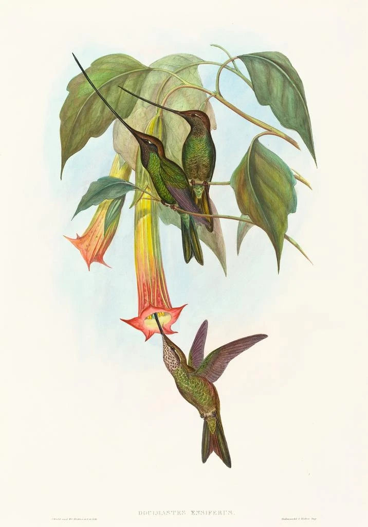 John Gould, attivo nel XIX secolo, è spesso considerato uno dei più grandi ornitologi del suo tempo. La sua passione per gli uccelli lo ha portato a viaggiare in tutto il mondo, raccogliendo esemplari e realizzando illustrazioni di precisione ineguagliabile. Influenzato dal movimento naturalista, Gould ha contribuito alla documentazione di molte specie, alcune delle quali non erano mai state descritte prima. La sua opera ha arricchito non solo la scienza ornithologica, ma ha anche influenzato artisti e naturalisti della sua epoca. La stampa di Docimastes ensiferus testimonia il suo impegno verso la bellezza e la diversità della fauna aviaria.