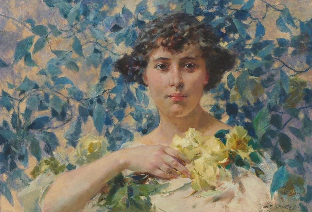 Donna contro arbusti in fiore - Zdzisław Jasiński
