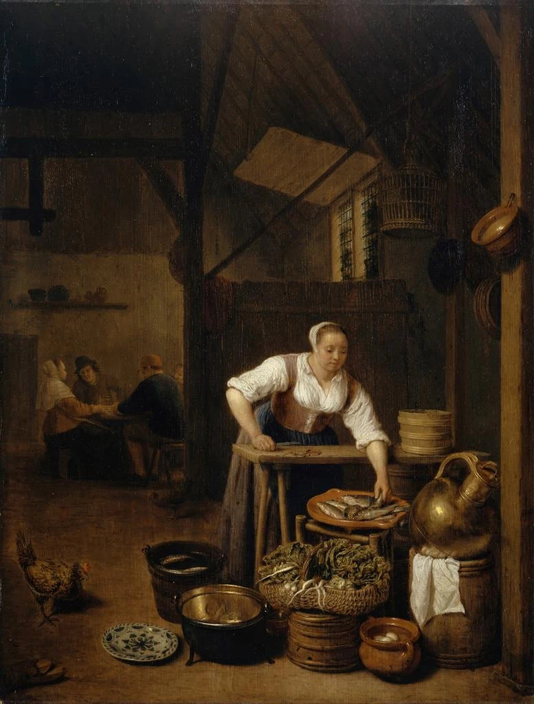 Donna delle pulizie che prepara del pesce - Hendrik Martensz Sorgh