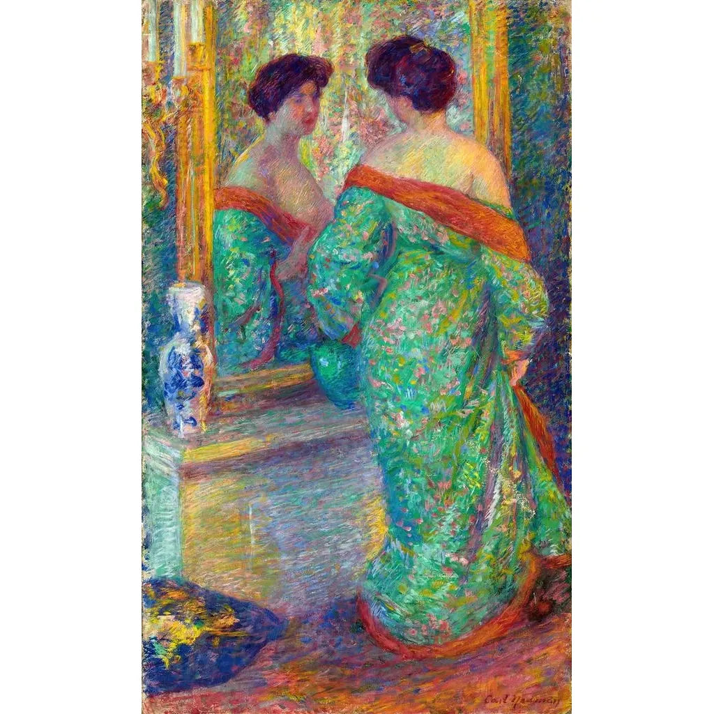 In questa opera affascinante, la composizione mette in evidenza una donna elegante, immersa in un'introspezione silenziosa. I colori delicati e le sfumature raffinate creano un'atmosfera serena, mentre la luce gioca sottilmente sulle superfici riflettenti dello specchio. La tecnica di Carl Newman, che combina realismo e impressionismo, invita lo spettatore a riflettere sulla dualità dell'immagine e della realtà. La signora, sia presente che distante, sembra catturare un momento di riflessione personale, rendendo questa stampa d'arte del quadro "Dame riflessa nello specchio" ancora più toccante.