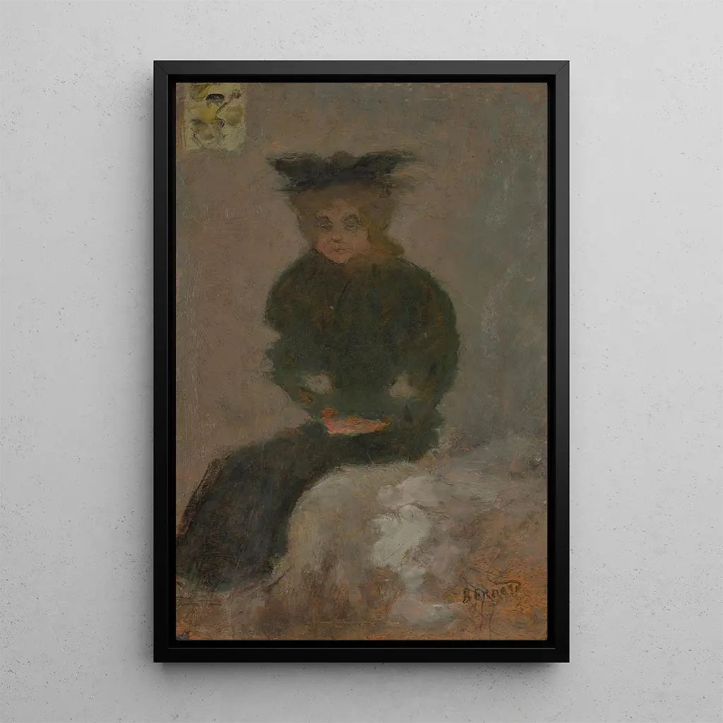 In questa opera emblematico, Pierre Bonnard cattura l’essenza di una donna seduta, elegantemente vestita con un cappello nero. I colori caldi e le sfumature delicate della tela evocano un’atmosfera dolce e intima. La luce gioca con le forme, creando ombre che sottolineano la silhouette della donna, mentre i dettagli floreali sullo sfondo aggiungono un tocco di poesia. La tecnica di Bonnard, mescolando impressionismo e post-impressionismo, conferisce a questa stampa d'arte una profondità emotiva, invitando lo spettatore a immergersi nell’universo personale del suo modello.