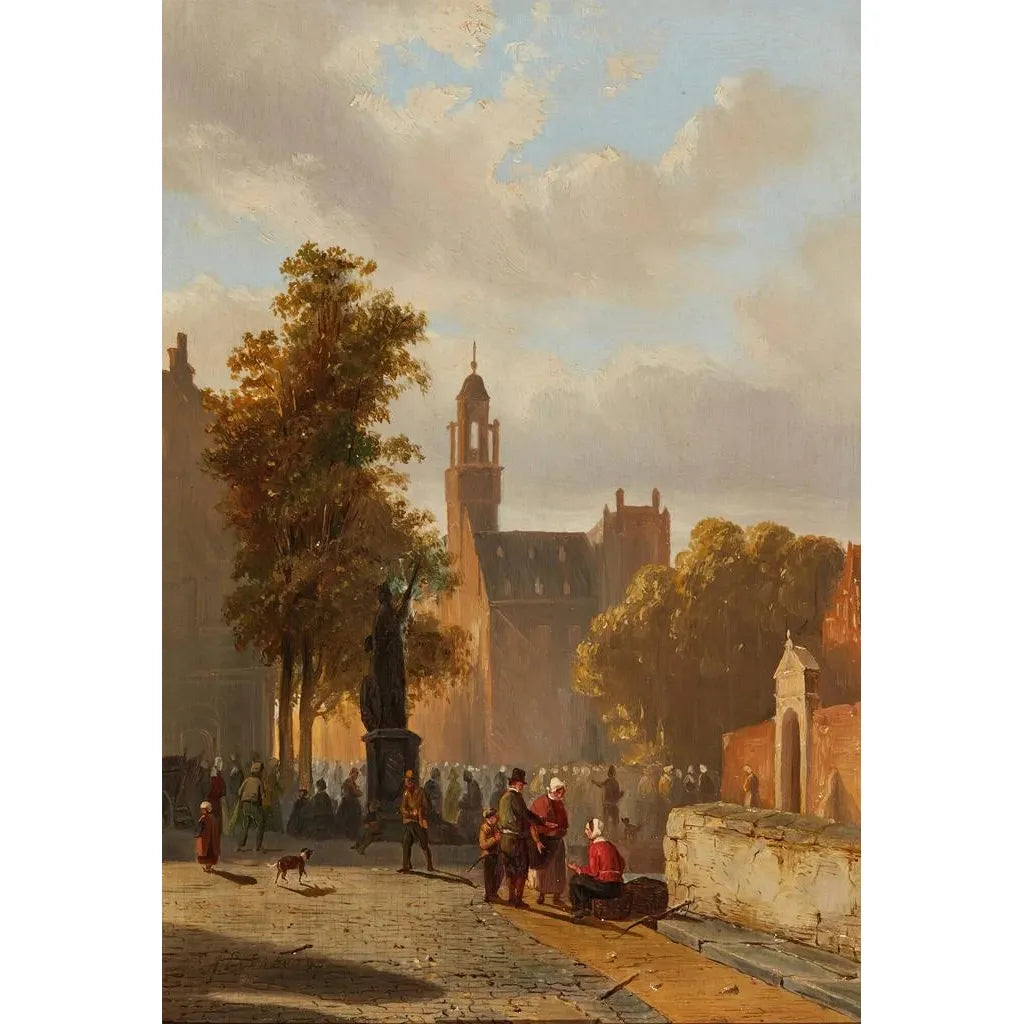 Adrianus Eversen, attivo nel XIX secolo, è riconosciuto per le sue rappresentazioni della vita urbana e dei paesaggi olandesi. Influenzato dal realismo, ha saputo catturare l'essenza della vita quotidiana nelle sue opere, integrando anche elementi della natura. Il suo stile, marcato da un'attenzione minuziosa ai dettagli e da una palette di colori armoniosi, riflette l'importanza dell'ambiente nel contesto sociale della sua epoca. Eversen è stato anche influenzato dai suoi contemporanei, il che gli ha permesso di distinguersi nel mondo dell'arte olandese, facendo delle sue opere testimoni preziosi della storia culturale.