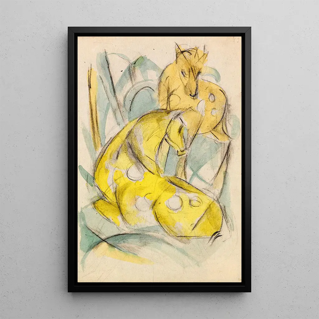 In questa opera vibrante, Franz Marc ci immerge in un universo dove il colore e la forma si incontrano per creare un'atmosfera quasi mistica. I due chevreuils jaunes, dalle silhouette stilizzate, sembrano sbocciare in un paesaggio astratto, dove le tonalità vivaci di giallo predominano. La tecnica dell'artista, mescolando pennellate audaci e forme geometriche, conferisce a questa tela una dinamica coinvolgente. L'opera evoca un'armonia tra gli animali e il loro ambiente, invitando lo spettatore a percepire la bellezza pura della natura attraverso un prisma emotivo.
