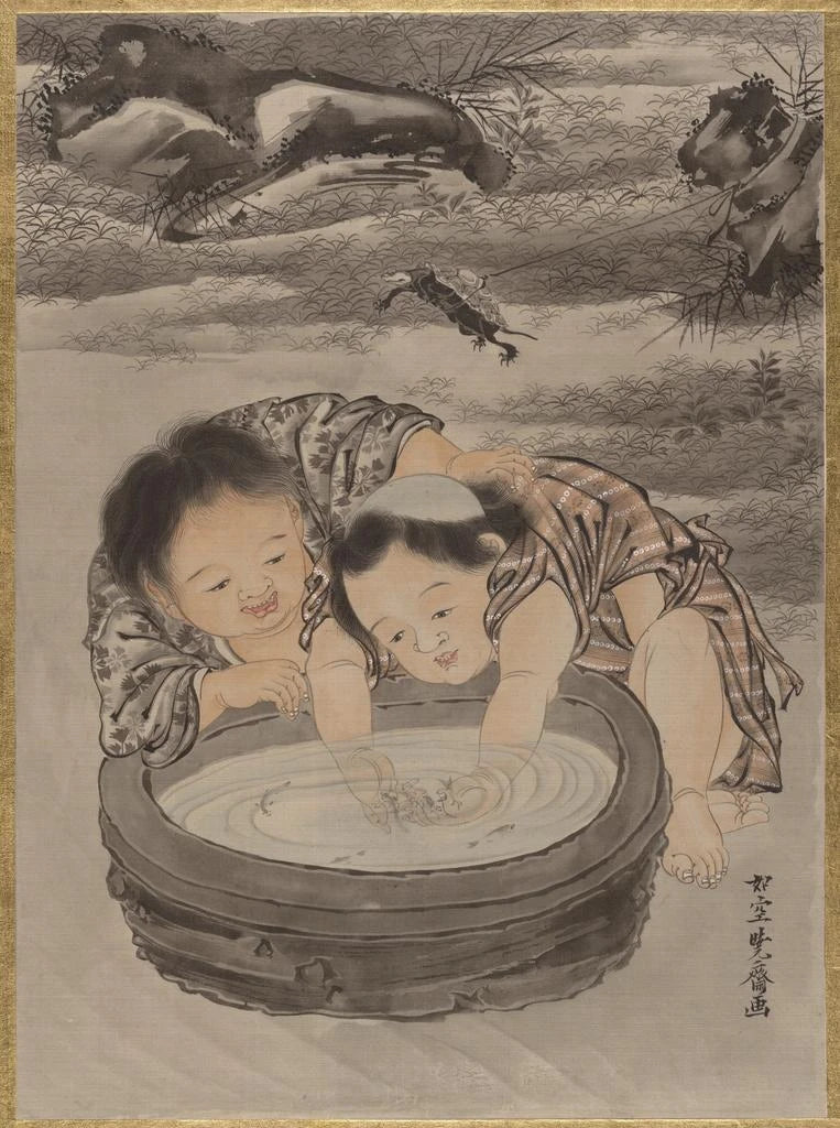 Due bambini che giocano con pesci rossi - Kawanabe Kyōsai