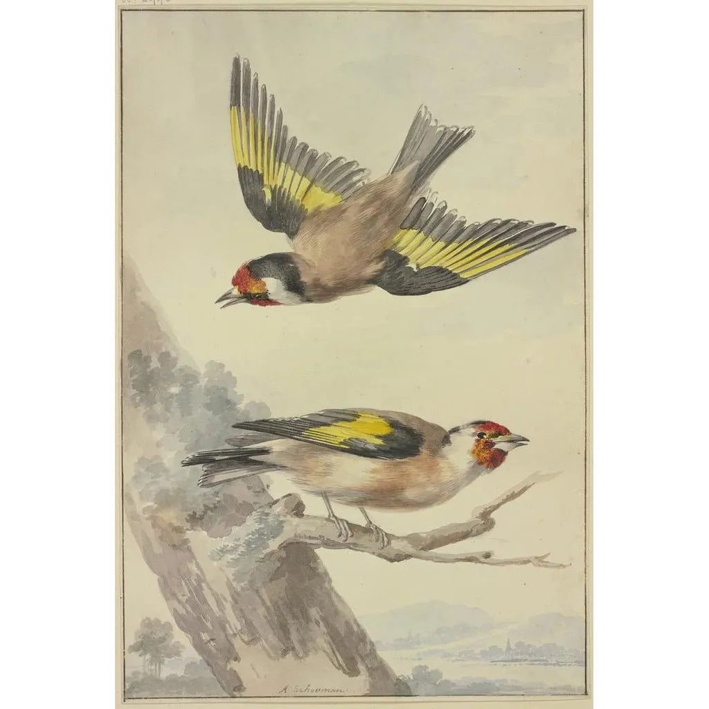 "Deux chardonnerets" est une œuvre qui célèbre la beauté et la vivacité de ces oiseaux colorés. Aert Schouman, avec son talent inégalé, parvient à capturer l'essence même de ces créatures, leurs plumages éclatants contrastant avec un fond délicat. Les chardonnerets, représentés dans une posture dynamique, semblent prêts à s'envoler, insufflant une énergie joyeuse à la composition. Les couleurs chaudes et les détails minutieux témoignent d'un savoir-faire exceptionnel, invitant le spectateur à s'immerger dans ce monde aviaire où chaque plume est une œuvre d'art en soi.