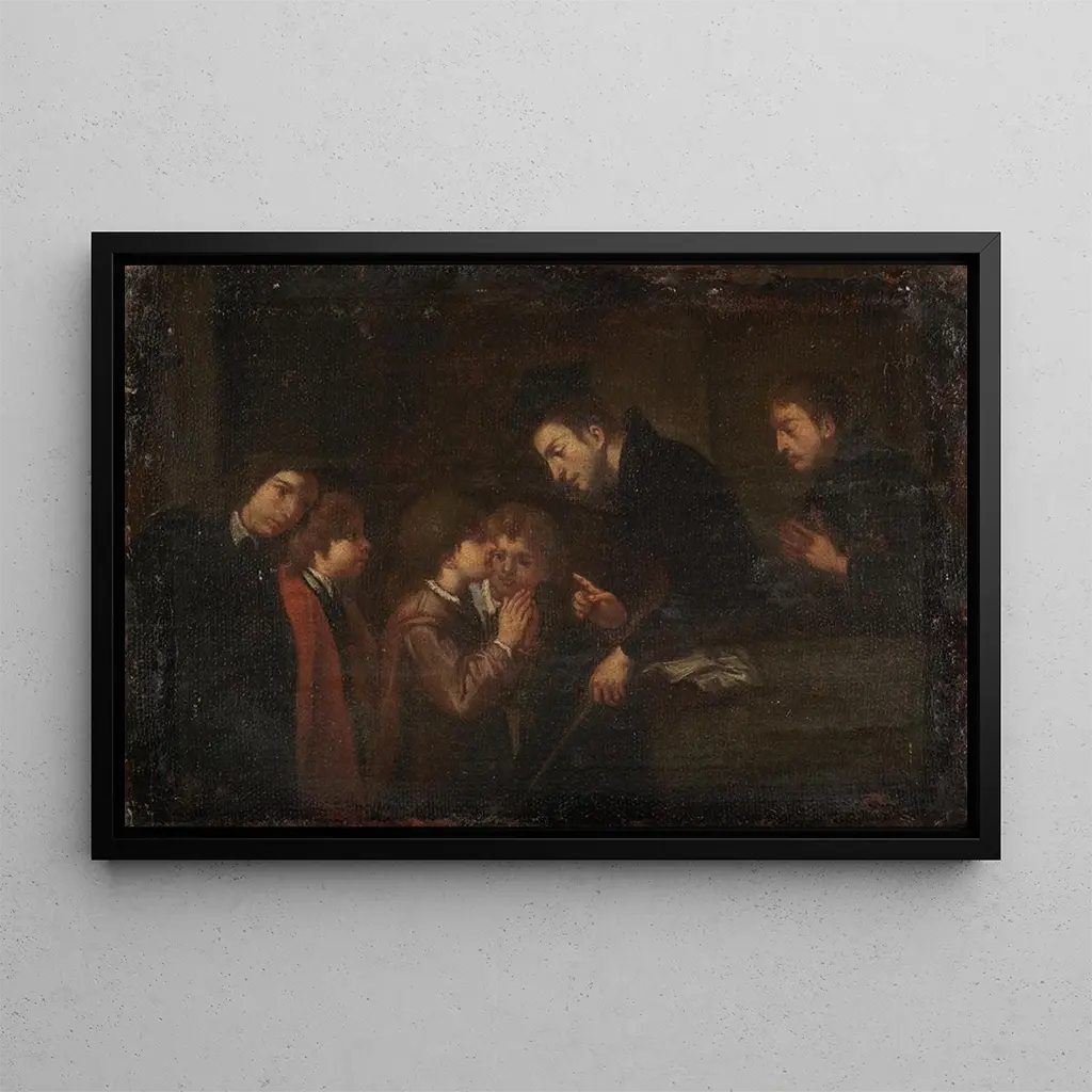 Deux garçons spirituels enseignant : una scoperta tra il sacro e il quotidiano In questa affascinante opera, "Due ragazzi spirituali insegnano", Pasquale de Rossi ci immerge in un universo dove spiritualità e semplicità della vita quotidiana si incontrano. Le due giovani figure, vestite con abiti tradizionali, sono rappresentate con espressioni piene di saggezza e curiosità. I colori caldi e terrosi, tipici della palette dell’artista, creano un’atmosfera rilassante, mentre la luce soffusa illumina subtilmente i loro volti, accentuando il loro ruolo di insegnanti. La composizione equilibrata invita lo spettatore a riflettere sulla natura dell’apprendimento e della trasmissione del sapere. Pasquale de Rossi: un maestro del barocco italiano Pasquale de Rossi, attivo nel XVII secolo, è un artista spesso poco conosciuto che ha saputo catturare l’essenza del suo tempo attraverso la sua arte. Influenzato dal movimento barocco, ha sviluppato uno stile caratterizzato da dettagli minuziosi e un’espressività toccante. Formatosi negli atelier dei grandi maestri del suo tempo, ha saputo integrare elementi della pittura fiamminga e italiana, arricchendo così la sua opera. Sebbene meno famoso dei suoi contemporanei, il suo lavoro merita di essere riscoperto, poiché offre uno sguardo prezioso sulla spiritualità e sui valori della società del suo tempo. Una riproduzione decorativa con molteplici vantaggi La riproduzione di "Due ragazzi spirituali insegnano" è un pezzo decorativo che saprà arricchire il vostro interno, sia in un salotto, uno studio o una camera da letto. Grazie alla qualità della stampa d'arte, conserva la finezza dei dettagli e l’armonia dei colori dell’originale, portando al contempo un tocco di eleganza e serenità al vostro spazio. Questo quadro, per il suo soggetto e la sua estetica, invita alla riflessione e alla contemplazione, rendendo questa tela una scelta ideale per chi apprezza l’arte e la spiritualità nella propria decorazione.