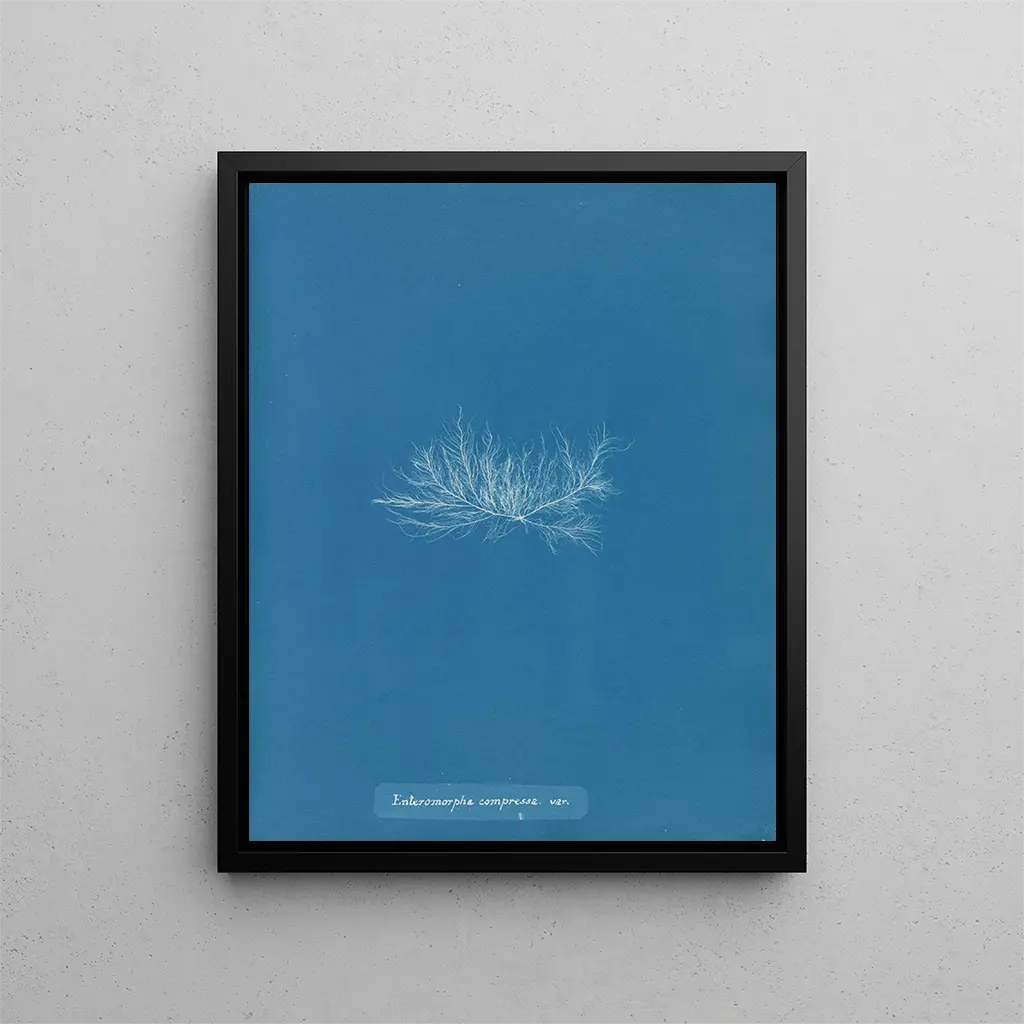 L'opera "Enteromorpha compressa var." si caratterizza per una tecnica unica che combina il cyanotype, procedimento fotografico inventato nel XIX secolo, e una sensibilità artistica propria di Atkins. Le sfumature di blu che si dispiegano sulla carta richiamano la profondità degli oceani, mentre la rappresentazione accurata dell’alga testimonia un’osservazione rigorosa e un rispetto profondo per la natura. Ogni curva e ogni texture sono riprodotte con cura, permettendo allo spettatore di apprezzare la bellezza intrinseca di questa pianta acquatica. Questo lavoro non è solo uno studio botanico, ma anche un’opera d’arte a tutti gli effetti, dove luce e ombra danzano sulla carta, creando un’atmosfera sia serena che dinamica.