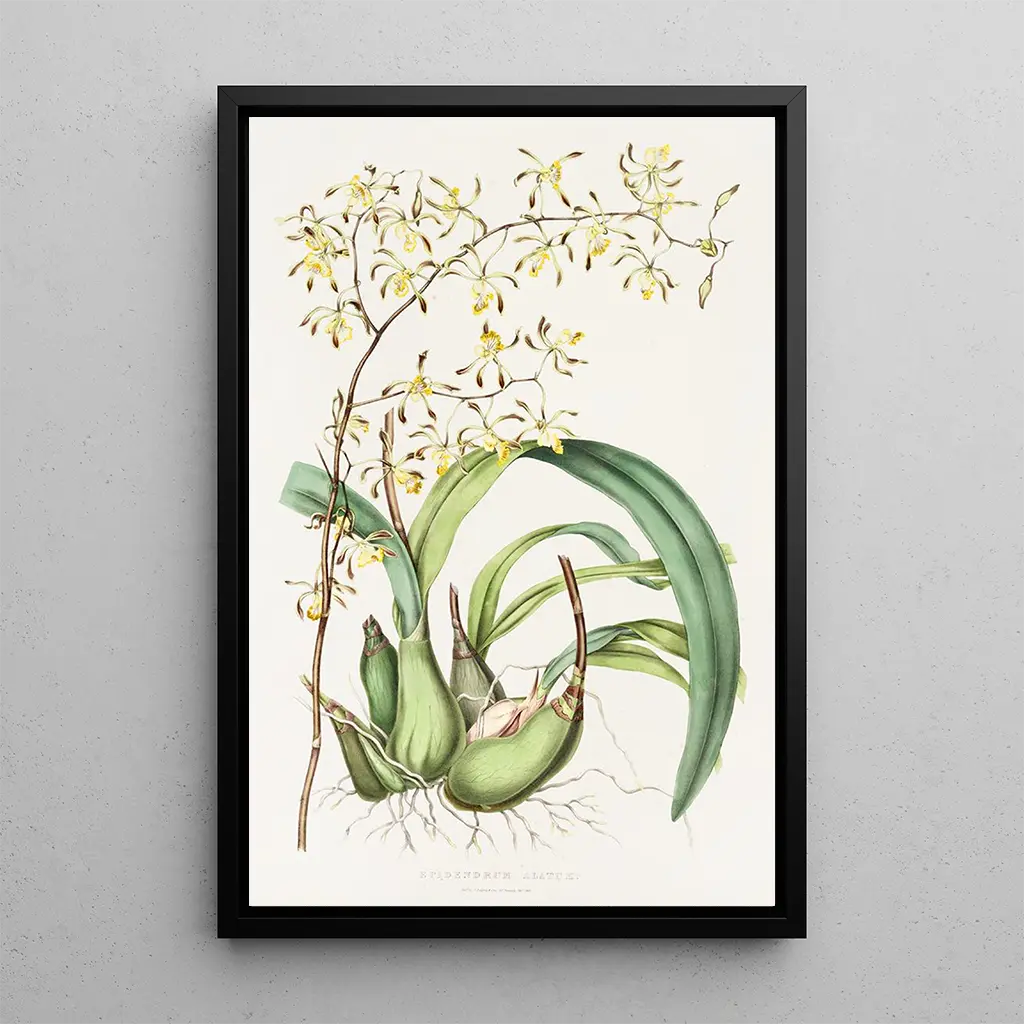 Epidendrum Alatum : una danza floreale brillante L'Epidendrum Alatum, con i suoi petali delicati e i colori vivaci, evoca un mondo di bellezza naturale. Questa opera, realizzata con una precisione meticolosa, cattura l'essenza stessa di questa orchidea tropicale. Le sfumature di giallo e rosso si mescolano armoniosamente, creando un'atmosfera calda e accogliente. La tecnica dell'artista, che combina acquerello e disegno, permette di percepire la leggerezza dei fiori evidenziandone al contempo la complessità. Ogni dettaglio è accuratamente lavorato, invitando lo spettatore a immergersi in un universo floreale dove la natura si svela in tutta la sua magnificenza. James Bateman : un pioniere dell'arte botanica James Bateman, botanico e artista del XIX secolo, ha saputo unire scienza e arte nelle sue opere. Operando in un'epoca in cui l'interesse per la botanica era in pieno sviluppo, ha contribuito alla documentazione delle specie vegetali attraverso le sue illustrazioni. Influenzato dalle scoperte scientifiche del suo tempo, Bateman ha saputo catturare la bellezza delle piante con una precisione senza pari. Le sue opere, tra cui l'Epidendrum Alatum, testimoniano il suo impegno verso la natura e il desiderio di condividere la sua passione con il mondo. La sua eredità perdura, ispirando numerosi artisti e botanici contemporanei. Una riproduzione decorativa con molteplici vantaggi La riproduzione dell'Epidendrum Alatum è un elemento decorativo ideale per abbellire qualsiasi spazio, che sia un soggiorno, un ufficio o una camera da letto. La qualità di stampa e la fedeltà ai colori originali la rendono una scelta attraente per gli appassionati d'arte e di botanica. Aggiungendo questa stampa alla vostra decorazione d'interni, portate un tocco di freschezza e vitalità nel vostro ambiente. Il suo fascino estetico e il carattere unico la rendono un elemento di conversazione affascinante, rendendo omaggio alla bellezza della natura.