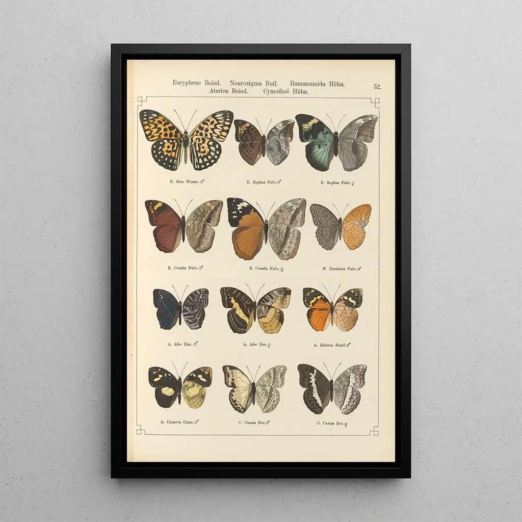 La stampa d'arte dell'opera "Papillons exotiques Pl052" di Otto Staudinger ci immerge in un universo vibrante dove i colori vivaci si mescolano alla delicatezza delle forme. Ogni farfalla, minuziosamente dettagliata, sembra prendere vita sulla tela, evocando leggerezza e grazia infinita. Le sfumature di blu, di giallo e di rosso si intrecciano armoniosamente, creando un'atmosfera allo stesso tempo gioiosa e rilassante. La tecnica di Staudinger, che combina precisione e sensibilità, permette di percepire quasi il battito delle ali di queste creature effimere, invitandoci ad apprezzare la bellezza fugace della natura.
