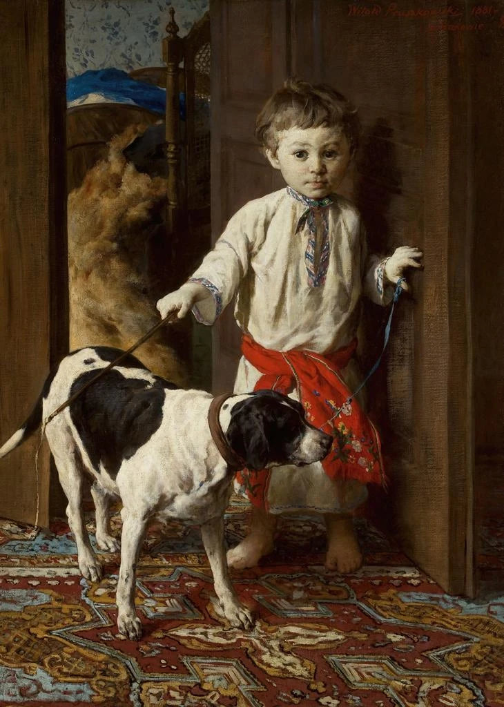 Witold Pruszkowski, nato nel 1846, è riconosciuto come uno dei pittori più influenti della Polonia alla fine del XIX secolo. La sua opera si inserisce in un contesto artistico ricco, dove mescola il realismo a elementi impressionisti, ispirandosi alle tradizioni folkloristiche del suo paese. Pruszkowski ha saputo catturare la vita quotidiana con grande finezza, e "Figlio dell'artista con un cane" ne è un esempio perfetto. Il suo approccio artistico testimonia una profonda comprensione delle emozioni umane e un desiderio di preservare momenti semplici ma significativi.