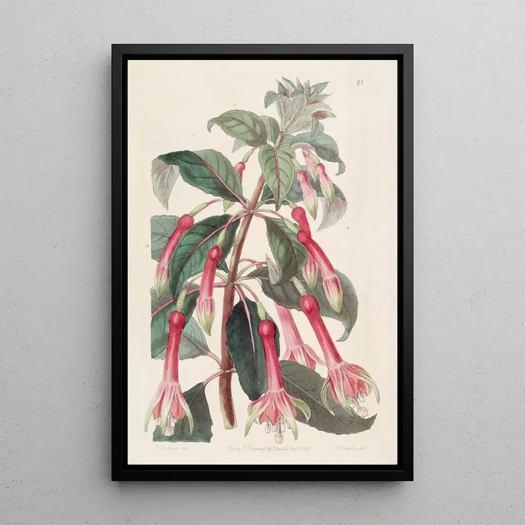 La stampa d'arte Fuchsia a foglie dentate ci immerge in un universo floreale dove le tonalità vivaci di rosa e viola si mescolano armoniosamente. I delicati fiori, sospesi come lanterne, attirano lo sguardo e invitano all'ammirazione. La tecnica dell'acquerello, utilizzata da Sydenham Edwards, permette di catturare la leggerezza dei petali offrendo al contempo profondità alle foglie dentate che li circondano. L'atmosfera che si sprigiona da questa opera è allo stesso tempo gioiosa e rilassante, evocando un giardino rigoglioso dove la natura prospera.