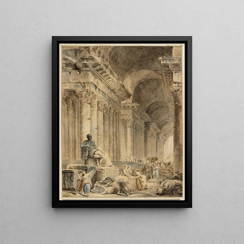 Galleria a colonne con volta e statua antica seduta - Hubert Robert Source: Galerie à colonnes voûtées avec statue antique assise - Hubert Robert