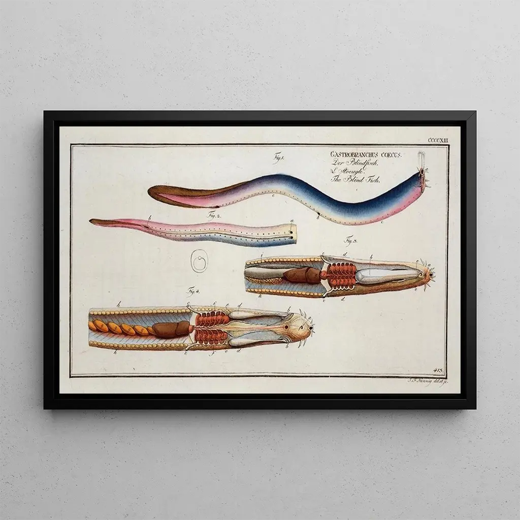 In questa stampa d'arte affascinante, il Gastrobranchus coecus, o pesce cieco, si svela nella sua singolarità. La tela mette in risalto sfumature di blu e verde, evocando le profondità misteriose dell'oceano. La tecnica dell'acquarello utilizzata da Marcus Elieser Bloch conferisce all'opera leggerezza e fluidità, come se il pesce fluttuasse nel suo habitat naturale. L'atmosfera che si percepisce da questa opera è allo stesso tempo intrigante e rilassante, invitando lo spettatore a immergersi in un mondo sottomarino poco esplorato.
