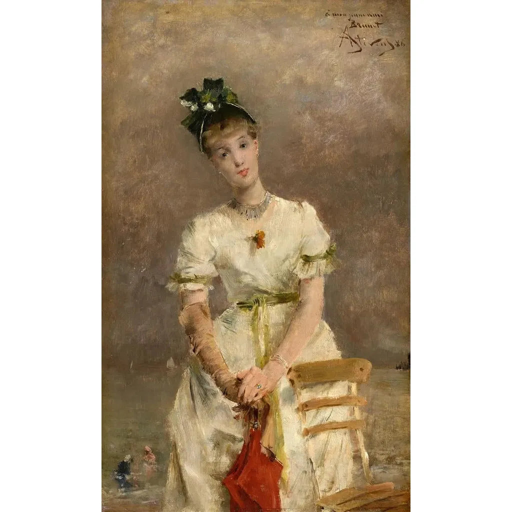 Dans cette stampa d'arte de "Jeune femme au bord de la mer", Alfred Stevens capture une scène empreinte de douceur et de tranquillité. La composition met en avant une jeune femme, vêtue d'une robe légère, qui se tient près des vagues, son regard perdu dans l'horizon. Les couleurs pastel, dominées par des nuances de bleu et de beige, évoquent une atmosphère estivale apaisante. La technique de Stevens, caractérisée par un réalisme délicat, donne vie à la texture des vêtements et à la luminosité de la mer, créant ainsi une invitation à la contemplation et à l’évasion.