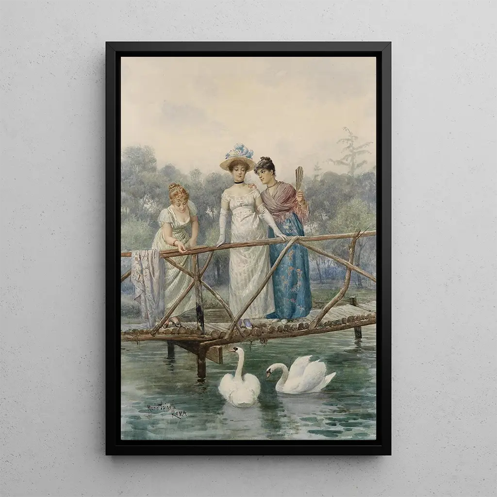 Nella riproduzione dell'opera "Giovani donne che nutrono i cigni", Mario Spinetti cattura un momento di dolcezza e armonia con la natura. I colori pastello si mescolano delicatamente, creando un'atmosfera rilassante. Le giovani donne, vestite con abiti leggeri, sembrano in comunione con i cigni, simboli di grazia e bellezza. La tecnica di Spinetti, che combina pittura ad olio e tocchi impressionisti, dà vita a questa scena bucolica, dove ogni dettaglio, dal piumaggio degli uccelli alle espressioni delle donne, è accuratamente lavorato per evocare una sensazione di pace e felicità.