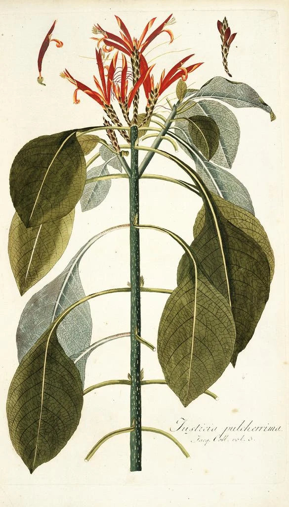 La stampa d'arte di Justicia pulcherrima ci immerge in un universo vibrante dove la natura si esprime con brillantezza. I petali dalle tonalità rosso vivo e sfumature aranciate si distinguono su uno sfondo verdeggiante, creando un contrasto sorprendente. La tecnica dell'acquerello, utilizzata da Nikolaus Joseph Freiherr von Jacquin, permette di catturare la delicatezza dei fiori offrendo al contempo una luminosità eccezionale. L'atmosfera che si percepisce da questa opera evoca il calore dei tropici e invita alla contemplazione della bellezza naturale.