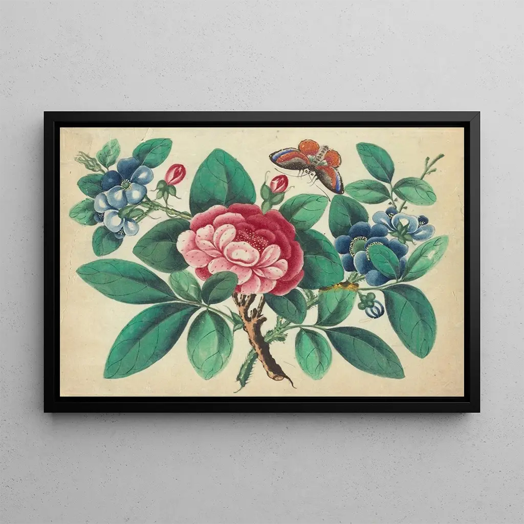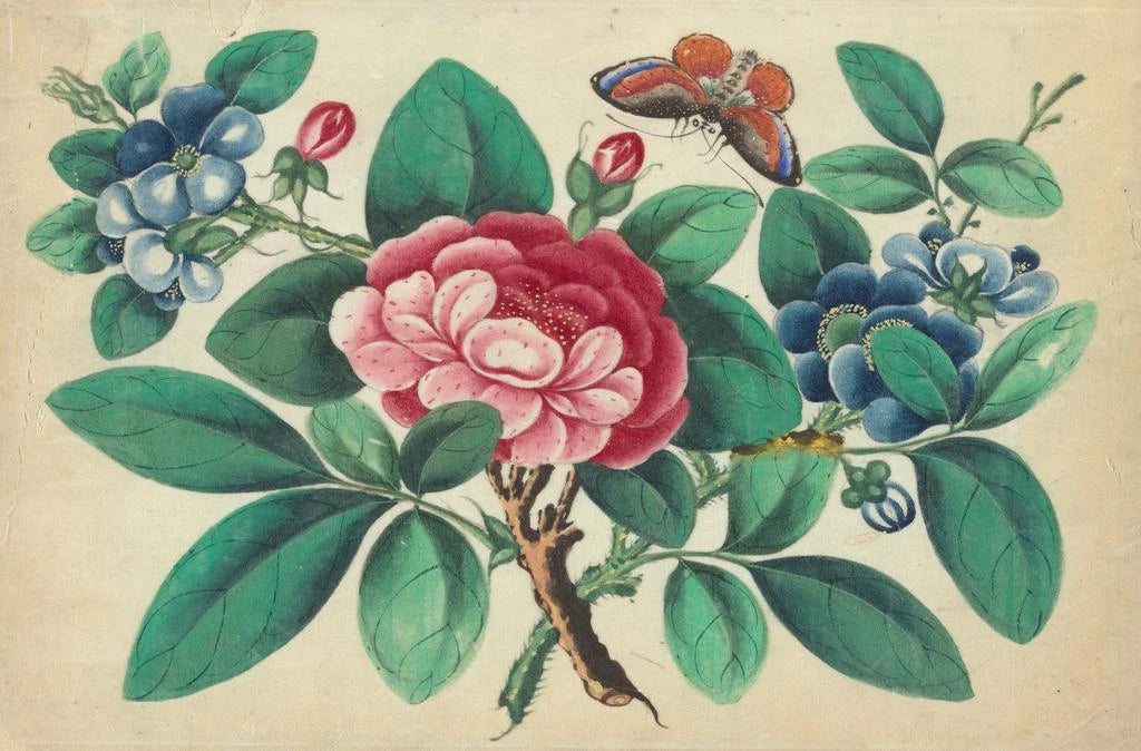 Grande Fiore Rosso, Fiori Blu, Farfalla - Anonimo
