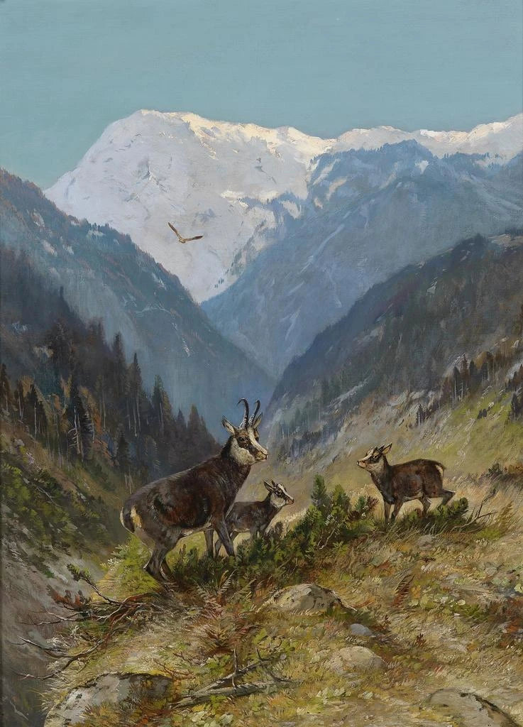 Moritz Müller, pittore naturalista del XIX secolo, è riconosciuto per la sua capacità di immortalare la fauna nel suo habitat naturale. La sua opera si inserisce in un contesto artistico in cui l'osservazione della natura diventa fondamentale, influenzato dal romanticismo e dal realismo. Müller ha saputo unire la sua passione per la pittura al suo amore per gli animali, permettendogli di creare opere che trascendono il semplice ritratto animale. La stampa d'arte del branco di stambecchi è un esempio perfetto del suo talento, illustrando non solo la bellezza degli animali, ma anche il loro ruolo nell'ecosistema montano.