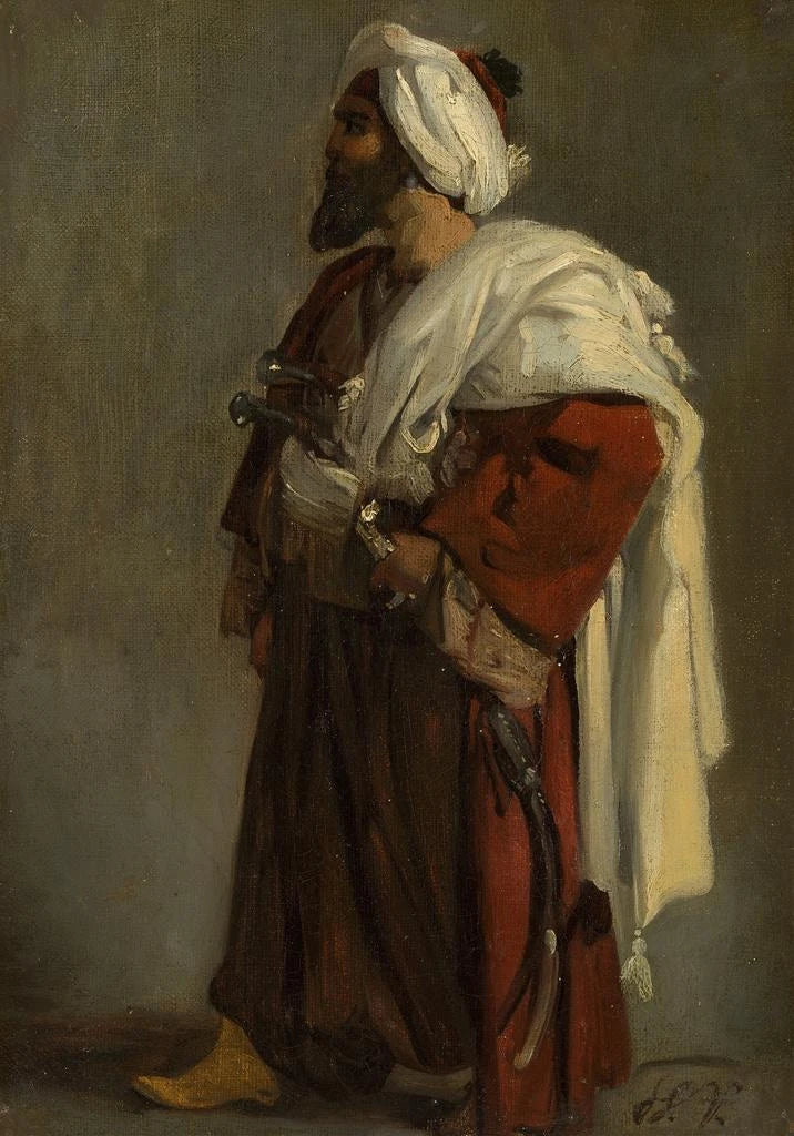 In "Guerriero arabo", Horace Vernet dipinge un personaggio maestoso, simbolo di forza e dignità. La tela, ricca di colori vivaci e di dettagli minuziosi, trasporta lo spettatore in un mondo dove l'eroismo e la nobiltà si incontrano. Vernet utilizza una tecnica di stampa d'arte ad olio che accentua le texture dei vestiti e delle armi, creando un'atmosfera al tempo stesso realistica ed epica. Le ombre e le luci sapientemente lavorate aggiungono profondità alla scena, rendendo il guerriero quasi vivo, pronto a lanciarsi nella battaglia.