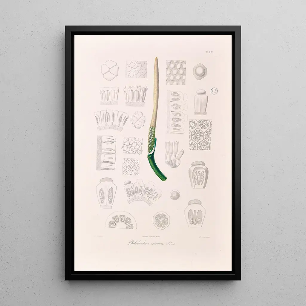 Icones Aroidearum Pl04 : un viaggio nel cuore della botanica La stampa d'arte Icones Aroidearum Pl04 è un'opera affascinante che immerge lo spettatore nell'universo ricco e vario delle piante aroidi. I dettagli minuziosi delle foglie e dei fiori, resi con una precisione notevole, evocano un'atmosfera di serenità e meraviglia. I colori vivaci e naturali, che vanno dai verdi profondi alle sfumature brillanti di bianco e viola, creano un quadro vivente che sembra quasi pulsare sotto gli occhi. La tecnica di incisione utilizzata da Schott permette di valorizzare le texture delicate delle piante, offrendo un invito alla contemplazione della bellezza della natura. Heinrich Wilhelm Schott : un pioniere della botanica illustrata Heinrich Wilhelm Schott, botanico e illustratore del XIX secolo, ha svolto un ruolo cruciale nella documentazione delle specie vegetali, in particolare quelle degli Aroidei. Nato nel 1794 in Austria, ha dedicato la sua vita allo studio delle piante tropicali, influenzato dalle esplorazioni botaniche della sua epoca. Schott ha collaborato con numerosi scienziati e ha pubblicato diversi volumi, tra cui Icones Aroidearum, che sono diventati riferimenti nel campo della botanica. Il suo approccio artistico e scientifico ha permesso di catturare la diversità e la complessità degli aroidi, facendolo una figura imprescindibile dell'illustrazione botanica. Una acquisizione decorativa con molteplici vantaggi La riproduzione del quadro Icones Aroidearum Pl04 è un pezzo decorativo che saprà arricchire qualsiasi spazio, che si tratti di un soggiorno, di un ufficio o di una camera da letto. La qualità di stampa e la fedeltà ai dettagli originali ne fanno una scelta ideale per gli appassionati di botanica e d'arte. L'attrattiva estetica di questa tela risiede nella sua capacità di portare un tocco di natura nel vostro ambiente, stimolando conversazioni sulla bellezza delle piante. Integrando questa opera nella vostra decorazione, optate per un pezzo che unisce cultura, scienza e arte, aggiungendo un tocco di freschezza al vostro spazio.