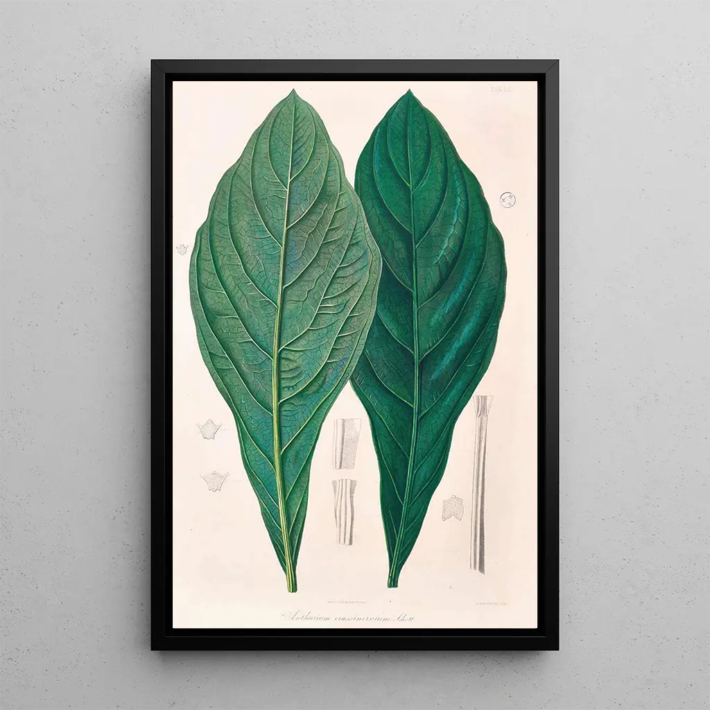 L'œuvre "Icones Aroidearum Pl12" di Heinrich Wilhelm Schott è un vero omaggio alla ricchezza e alla diversità delle piante aroidi. Attraverso dettagli minuziosi e colori vibranti, Schott riesce a catturare l'essenza di queste specie affascinanti. Le sfumature di verde, giallo e viola si mescolano armoniosamente, creando un'atmosfera allo stesso tempo vivace e rilassante. Ogni foglia e ogni fiore sono rappresentati con una precisione notevole, invitando lo spettatore a una contemplazione attenta delle meraviglie della natura. Questa stampa d'arte è più di una semplice illustrazione botanica; evoca un mondo rigoglioso in cui ogni pianta racconta una storia.