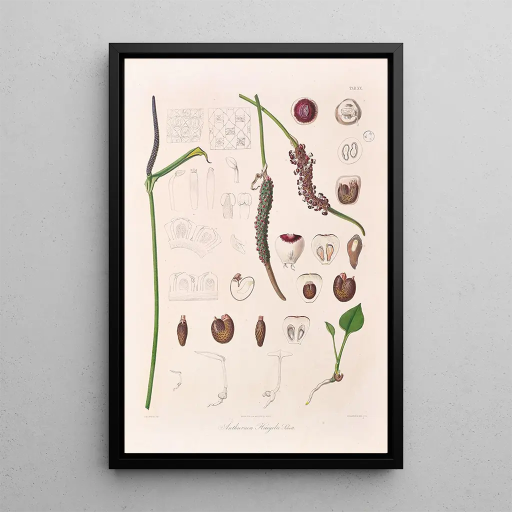 La stampa d'arte di Icones Aroidearum Pl20 ci trasporta in un mondo rigoglioso dove la diversità delle piante viene messa in risalto con brillantezza. Ogni dettaglio, dalle nervature delle foglie alle sfumature dei fiori, è accuratamente riprodotto, testimonianza dell’esperienza di Heinrich Wilhelm Schott. I colori vivaci e la composizione armoniosa creano un’atmosfera vivace e dinamica, invitando lo spettatore ad apprezzare la bellezza della flora. Quest’opera, realizzata con una raffinata tecnica ad acquerello, evoca una sensazione di leggerezza e delicatezza, catturando l’essenza stessa della natura nella sua piena magnificenza.