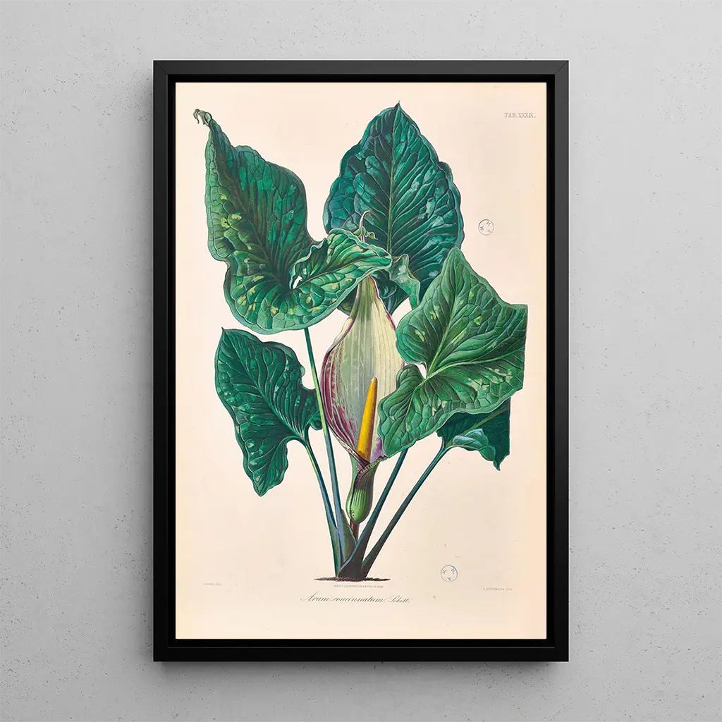 Icones Aroidearum Pl39 : una celebrazione della biodiversità La stampa d'arte di Icones Aroidearum Pl39 si presenta come un omaggio vibrante alla ricchezza delle piante aroidi. Questo quadro, ricco di dettagli, ci immerge in un universo botanico dove ogni foglia e ogni fiore sembrano raccontare una storia. I colori, che vanno dai verdi profondi alle sfumature vivaci di giallo e viola, creano un'atmosfera allo stesso tempo rilassante e affascinante. La tecnica dell’acquarello, usata con maestria, permette di catturare la delicatezza delle texture e la trasparenza dei petali, invitando lo spettatore a una contemplazione attenta della natura. Heinrich Wilhelm Schott : un pioniere dell’illustrazione botanica Heinrich Wilhelm Schott, botanico e illustratore del XIX secolo, ha saputo lasciare il segno nella sua epoca grazie ai suoi contributi allo studio delle piante tropicali. Originario dell'Austria, Schott ha viaggiato in tutto il mondo, impregnandosi di paesaggi esotici e di varietà di flora che ha poi illustrato con precisione. La sua opera, spesso associata al movimento romantico, testimonia una passione per la natura e un desiderio di preservarla attraverso l'arte. Le illustrazioni di Schott, in particolare quelle delle aroidi, sono diventate riferimenti nel campo botanico, unendo scienza ed estetica. Una scelta decorativa con molteplici vantaggi La stampa d'arte di Icones Aroidearum Pl39 rappresenta una scelta decorativa ideale per diversi spazi abitativi, che si tratti di un soggiorno, di un ufficio o di una camera da letto. La qualità di stampa garantisce una fedeltà notevole ai dettagli originali, aggiungendo un tocco di verde e freschezza al vostro interno. L'attrattiva estetica di questa tela la rende un punto focale affascinante, suscitando l'ammirazione dei vostri ospiti. Integrando quest'opera nella vostra decorazione, offrite non solo un pezzo d'arte, ma anche un omaggio alla bellezza della natura, arricchendo così il vostro ambiente quotidiano.