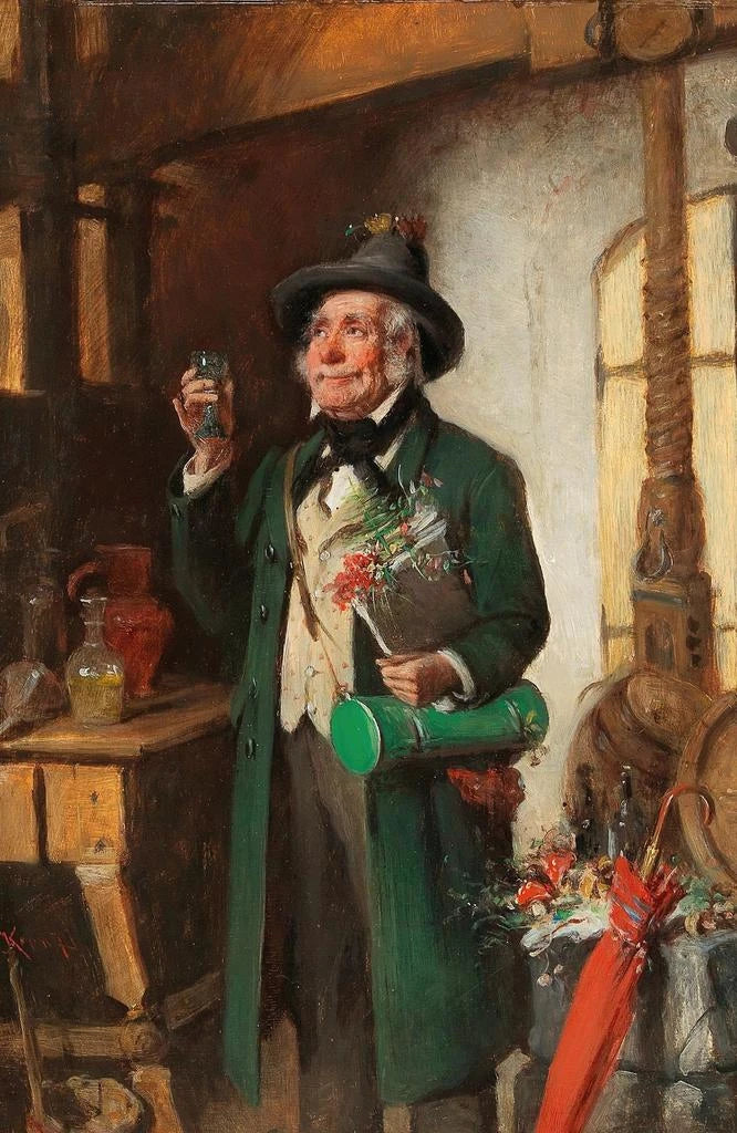 In "Le botaniste satisfait", Hermann Kern ci immerge in un universo dove la natura e la scienza si incontrano. La tela, ricca di dettagli, presenta un botanico assorto nelle sue osservazioni, circondato da piante rigogliose. I colori vivaci e le sfumature di verde evocano la freschezza di un giardino in piena fioritura, mentre la luce soffusa crea un'atmosfera rilassante. La tecnica dell'artista, che mescola realismo e impressionismo, permette di percepire la passione e l'ammirazione del botanico di fronte alla bellezza della flora. Quest'opera invita alla contemplazione e alla riflessione sul nostro rapporto con la natura.