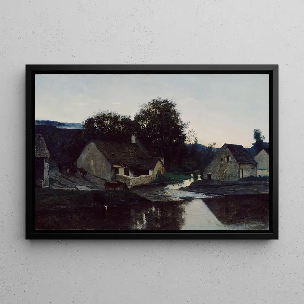 La stampa d'arte di Le Hameau d'Optevoz di Charles François Daubigny trasporta lo spettatore in un paesaggio tranquillo, dove la natura e l'architettura si incontrano armoniosamente. Le tonalità morbide e luminose evocano una luce dorata, mentre i dettagli delle case e degli alberi creano un'atmosfera di tranquillità. La tecnica di Daubigny, caratterizzata da pennellate rapide ed espressive, dà vita a questa scena rurale. Ogni elemento, dalle nuvole ai riflessi nell'acqua, contribuisce a una composizione equilibrata che invita all'evasione e alla contemplazione.