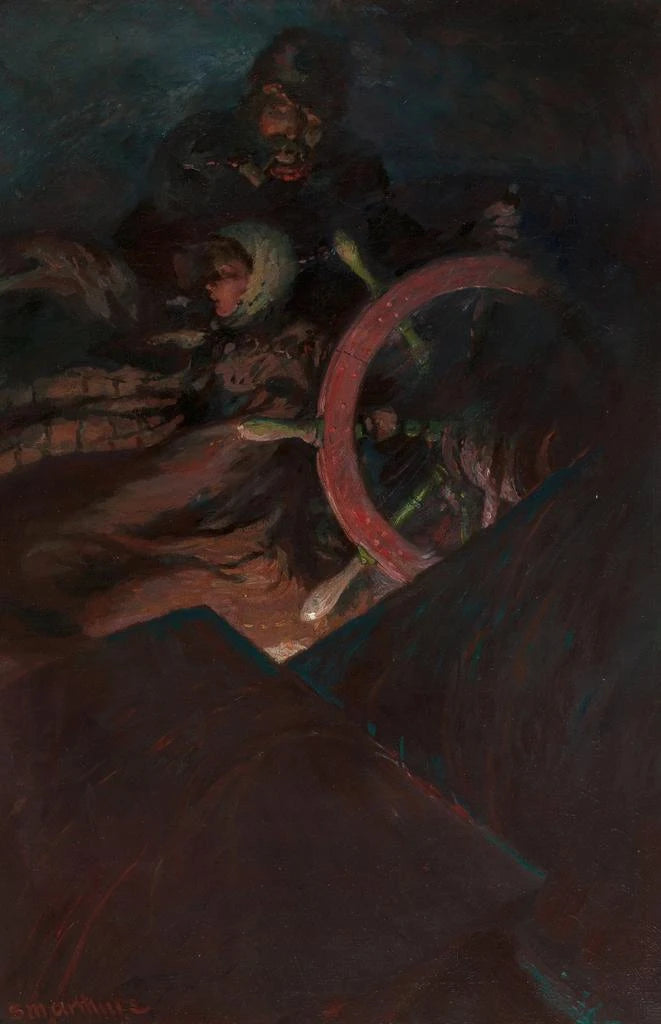 "Le Naufrage de l'Hespérus" è un'opera emblematico che immerge lo spettatore in una scena di disperazione e lotta contro gli elementi. Stanley Massey Arthurs, con un'impressionante padronanza di luci e ombre, dipinge una nave in pericolo, presa in una tempesta scatenata. Le onde tumultuose e il cielo tempestoso creano un'atmosfera drammatica, mentre le figure dei marinai, congelate in pose di disperazione, rafforzano l'intensità emotiva della scena. La tecnica di pittura, sia realistica che espressiva, permette di percepire la potenza della natura e la fragilità dell'uomo di fronte ad essa.