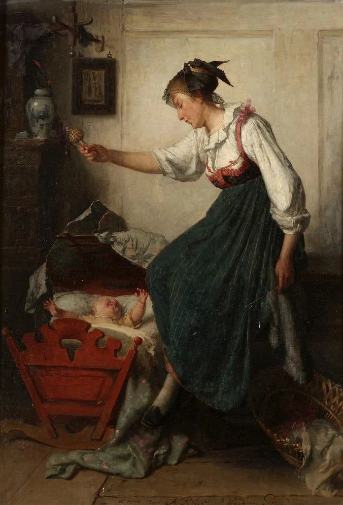 In questa delicata opera, Il nuovo sonaglio, Théodore Gérard cattura un momento intimo tra una madre e il suo bambino. La composizione è accuratamente orchestrata, mettendo in risalto le espressioni dei personaggi, rivelando un'atmosfera dolce e calorosa. I colori pastello predominano, creando un ambiente rilassante, mentre i dettagli minuziosi degli abiti e degli accessori aggiungono una dimensione realistica alla scena. La tecnica di Gérard, che combina pittura ad olio e tocchi di luce, dà vita a questa toccante rappresentazione della maternità.
