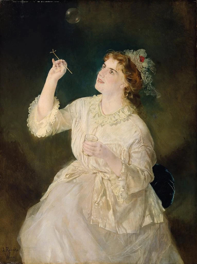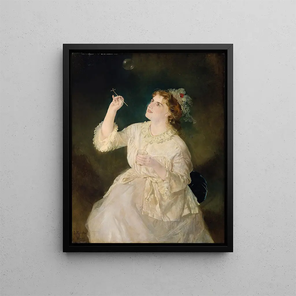 La tecnica pittorica di Anton Romako si distingue per il suo uso sottile della luce e dei colori, che conferiscono alla scena un’atmosfera allo stesso tempo dolce e vibrante. Le tonalità pastello, mescolate a tocchi più vivaci, creano un contrasto armonioso che attira lo sguardo e mantiene l’attenzione dello spettatore. La composizione è accuratamente orchestrata, con uno sfondo sfocato che mette in risalto il protagonista, suggerendo allo stesso tempo un mondo esterno ricco e vivo. Questa scelta stilistica rafforza l’idea che la bellezza risiede nei dettagli semplici della vita quotidiana. Il modo in cui Romako rende il movimento delle bolle, quasi danzanti sotto la luce, è un’impresa tecnica che testimonia la sua abilità nel catturare non solo l’immagine, ma anche l’emozione che ne deriva.