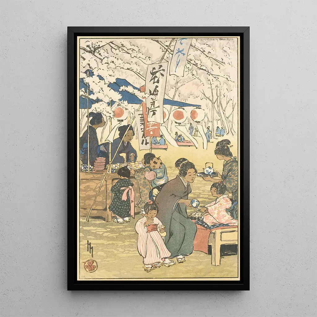 In "Le temps des fleurs à Tokyo", Helen Hyde cattura l'essenza di un momento fugace, dove la bellezza dei ciliegi in fiore si mescola alla vita quotidiana. La composizione delicata, con le sue tonalità pastello e i tocchi di rosa vivace, evoca un'atmosfera di serenità e contemplazione. I personaggi, spesso vestiti con kimono tradizionali, si fondono armoniosamente in questo paesaggio floreale, creando un'interazione poetica tra l'umano e la natura. La tecnica dell'acquarello, con le sue sfumature sottili, accentua la leggerezza della scena, invitando lo spettatore a immergersi in questa visione idilliaca del Giappone.