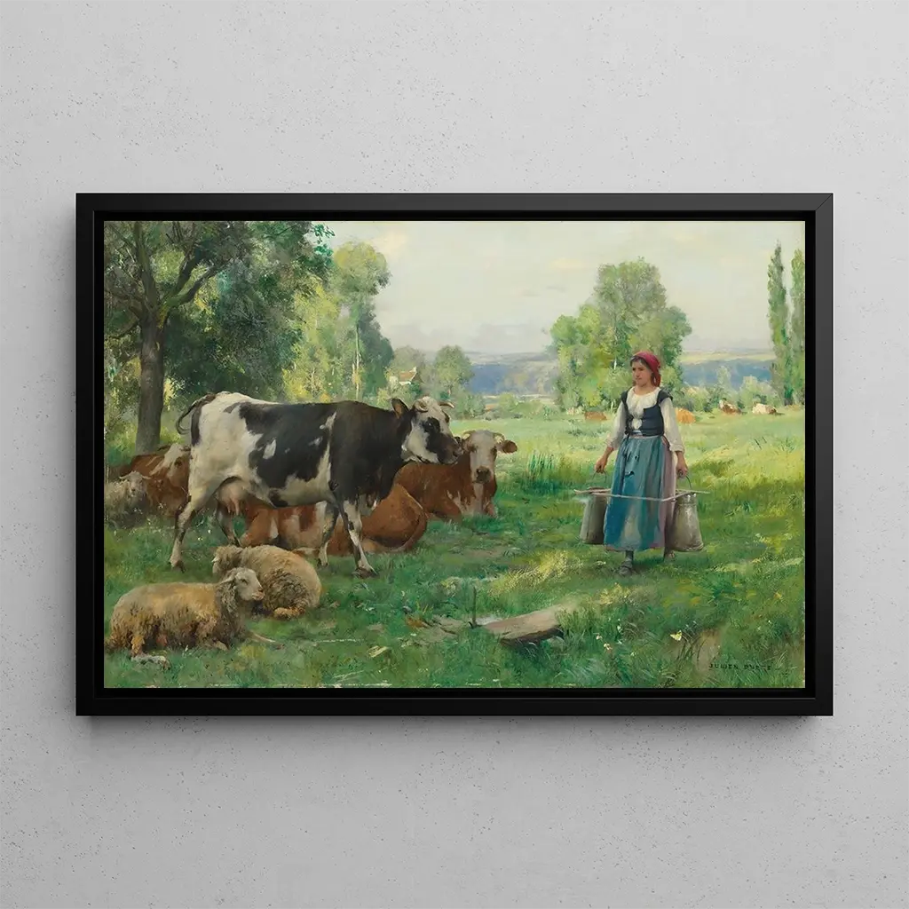 In un pascolo: un'ode alla serenità bucolica In questa stampa d'arte di "In un pascolo", Julien Dupré ci trasporta nel cuore di una scena pastorale intrisa di tranquillità. Le tonalità morbide della natura, dai verdi vivaci ai caldi marroni, si armonizzano per creare un'atmosfera rilassante. La tecnica impressionista di Dupré si manifesta attraverso pennellate fluide, catturando la luce che danza sulle superfici. Gli animali, pacificamente dispersi nel paesaggio, aggiungono un tocco di vita a questa tela, invitando lo spettatore a immergersi in un momento di calma e contemplazione. Julien Dupré: un maestro della pittura rurale Julien Dupré, attivo alla fine del XIX secolo, è riconosciuto per le sue rappresentazioni della vita rurale francese. Influenzato dall'impressionismo, ha saputo catturare la bellezza dei paesaggi e la semplicità della vita contadina. La sua carriera, segnata da un'attenzione particolare ai dettagli e alla luce, gli ha permesso di affermarsi tra gli artisti della sua epoca. Dupré ha spesso scelto di dipingere scene di campagna, mettendo in evidenza la relazione armoniosa tra l'uomo e la natura, il che gli ha valso un riconoscimento duraturo nel mondo dell'arte. Un acquisto decorativo con molteplici vantaggi La stampa d'arte di "In un pascolo" è un pezzo decorativo ideale per portare un tocco di natura nel vostro interno. Che sia in un soggiorno, un ufficio o una camera da letto, questa opera evoca serenità e la bellezza dei paesaggi rurali. La qualità della riproduzione garantisce fedeltà ai colori e ai dettagli dell'opera originale, offrendo al contempo un'attrattiva estetica indiscutibile. Scegliendo questa tela, optate per una decorazione che ispira pace e contemplazione, arricchendo così il vostro spazio vitale.