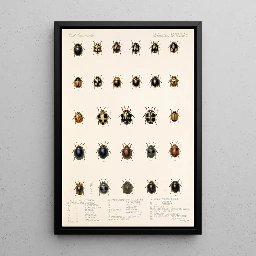 L'œuvre "Insecta Coleoptera Pl 299" di Frederick DuCane Godman è un'illustrazione affascinante che cattura l'essenza dei coleotteri con una precisione notevole. I colori vivaci e i dettagli minuziosi di ogni insetto rivelano un'atmosfera allo stesso tempo scientifica e artistica. Godman, utilizzando tecniche di incisione e acquerello, riesce a trasmettere la diversità e la complessità di queste creature. Ogni elemento della composizione, dalle ali delicate alle texture dei corpi, invita a una contemplazione attenta e meravigliata, facendo di questa stampa d'arte un vero capolavoro di osservazione naturalistica.