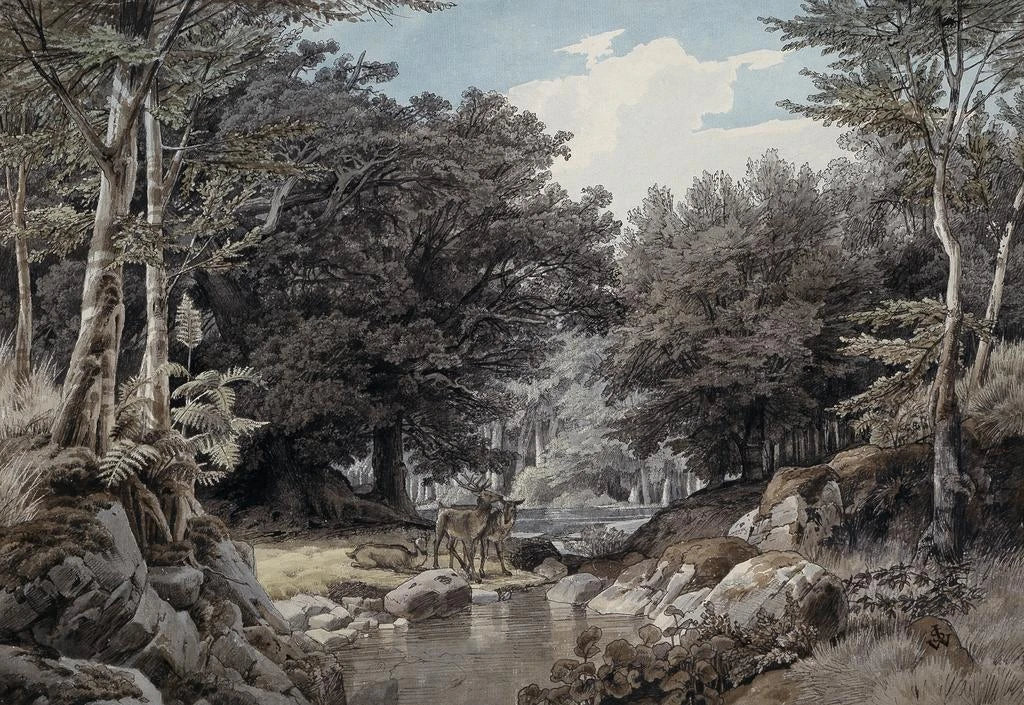 Interno di foresta con cervi vicino all'acqua - Johann Wilhelm Schirmer