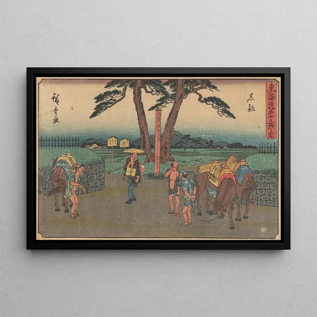 Ishibe : una scena di serenità senza tempo La stampa d'arte Ishibe di Andō Hiroshige ci trasporta in un mondo di calma e bellezza. Quest'opera iconica, tratta dalla serie delle "Vedute delle cinquantatré stazioni del Tōkaidō", cattura una scena pacifica in cui l'armonia tra l'uomo e la natura è messa in evidenza. I colori delicati e le sfumature sottili di blu e verde creano un'atmosfera rilassante, mentre la tecnica del legno intagliato, caratteristica dell'ukiyo-e, conferisce all'intera composizione una texture unica. Ogni dettaglio, dalle silhouette dei personaggi agli elementi naturali circostanti, evoca un invito alla contemplazione e all'evasione. Andō Hiroshige : il maestro dell'ukiyo-e Andō Hiroshige, figura emblematica del movimento ukiyo-e in Giappone nel XIX secolo, ha saputo catturare l'essenza della sua epoca attraverso le sue opere. Influenzato dalla natura e dalla vita quotidiana, Hiroshige ha sviluppato uno stile distintivo che unisce precisione e poesia. Le sue stampe d'arte, come quella di Ishibe, testimoniano una sensibilità unica verso la bellezza effimera del mondo. Attivo durante l'era Edo, ha lasciato un'eredità duratura, ispirando numerosi artisti occidentali e giapponesi. Il suo approccio innovativo alla prospettiva e al colore ha segnato la storia dell'arte, rendendolo uno dei maestri più rispettati del suo tempo. Un acquisto decorativo con molteplici vantaggi La stampa d'arte Ishibe è un pezzo decorativo che si integra armoniosamente in diversi spazi, che si tratti di un soggiorno, di un ufficio o di una camera da letto. La sua qualità di stampa fedele e i colori rilassanti ne fanno una scelta ideale per creare un'atmosfera zen e rilassante. Aggiungendo questa tela alla tua decorazione, porti un tocco di eleganza e cultura giapponese nel tuo ambiente. L'attrattiva estetica di questa opera non mancherà di suscitare l'interesse dei tuoi ospiti, offrendoti allo stesso tempo un momento di serenità ogni volta che poserai gli occhi su di essa.