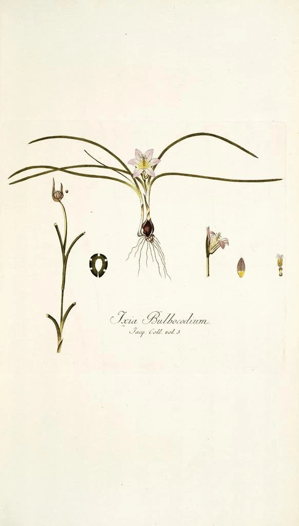 Nikolaus Joseph Freiherr von Jacquin, botanico e artista del XVIII secolo, ha segnato la sua epoca con i suoi contributi alla botanica e all'arte. I suoi viaggi in tutto il mondo gli hanno permesso di scoprire e illustrare specie vegetali rare, facendolo diventare un pioniere nel campo dell'illustrazione botanica. Il suo stile, che unisce precisione scientifica e sensibilità artistica, è rappresentativo dello spirito delle Illuminazioni. "Ixia bulbocodium" testimonia il suo impegno nel rendere omaggio alla bellezza della natura, arricchendo al contempo la conoscenza botanica del suo tempo.
