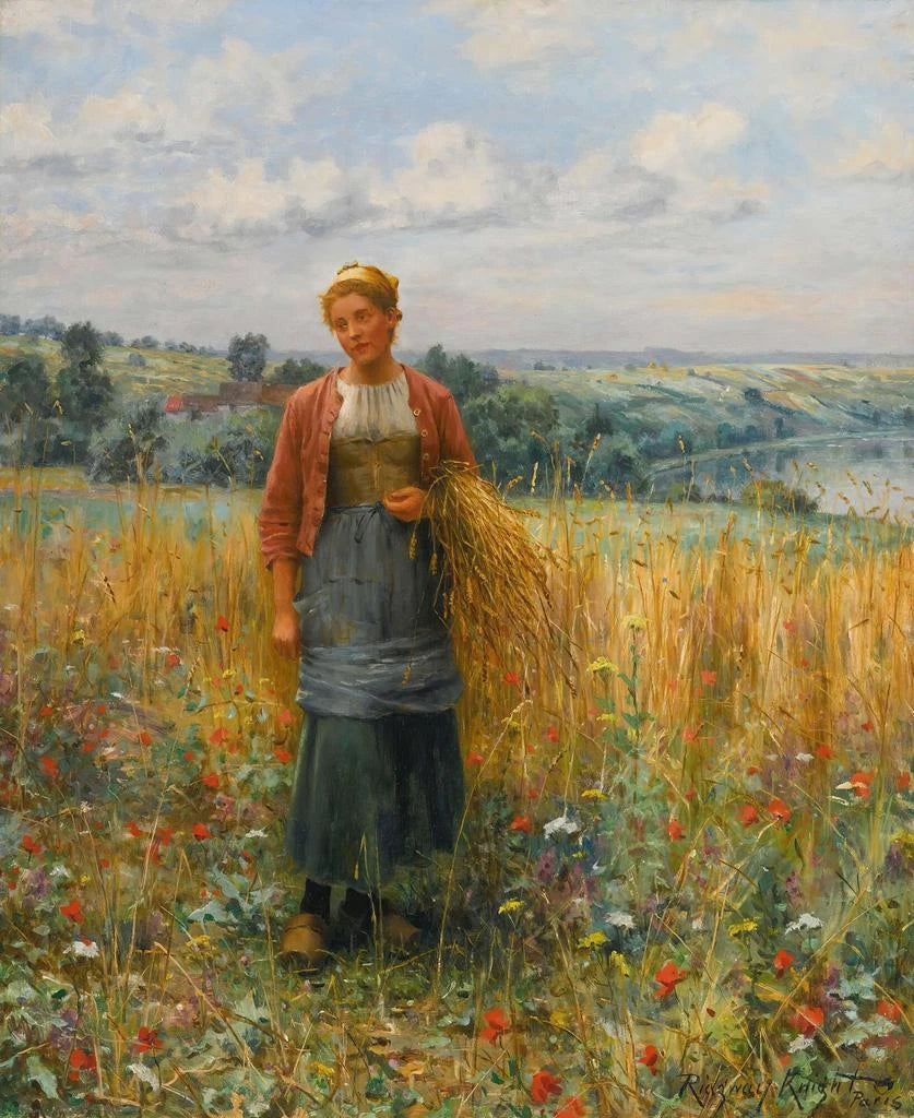 Daniel Ridgway Knight, pittore americano del XIX secolo, è spesso associato al movimento impressionista e al realismo. Il suo percorso artistico lo porta a esplorare i paesaggi della Francia, dove scopre un'ispirazione rinnovata nella vita dei contadini e nelle scene di vita rurale. La sensibilità di Knight verso la bellezza della natura e la condizione umana si riflette nelle sue opere, che catturano istanti di vita intrisi di malinconia e gioia. La sua influenza è palpabile nel mondo dell'arte, ispirando generazioni di pittori ad abbracciare la natura e le emozioni umane come soggetti centrali del loro lavoro. "Jeannine Gleaning" è un esempio perfetto