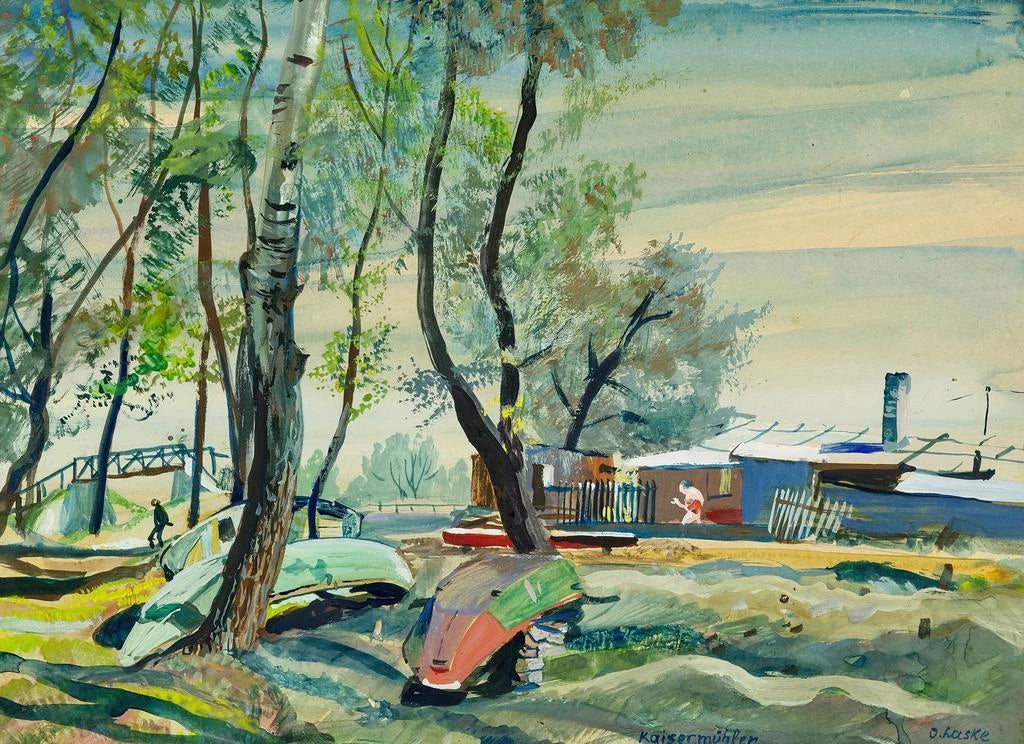 Kaisermühlen, opera emblematica di Oskar Laske, ci immerge in un'atmosfera tranquilla dove l'urbanità si mescola alla natura. La composizione, ricca di dettagli, ci presenta un paesaggio urbano immerso in una luce soffusa, dove gli edifici si riflettono nelle acque calme di un canale. I colori pastello, dominati da sfumature di blu e verde, creano un'armonia visiva rilassante. La tecnica di Laske, che combina impressionismo e realismo, permette di percepire la tranquillità di questo luogo, invitando lo spettatore a perdersi e a contemplare la bellezza della quotidianità.