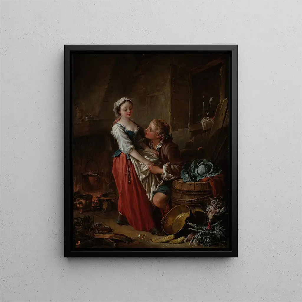 La Belle Cuisinière, opera emblematico di François Boucher, incarna perfettamente lo spirito del XVIII secolo francese. Questo dipinto, che rappresenta una scena della vita quotidiana con un tocco di sensualità e raffinatezza, ci immerge in un universo dove arte e vita si mescolano armoniosamente. La tavola, allo stesso tempo intima e teatrale, rivela una donna intenta a cucinare, simbolo di domesticità e bellezza femminile. Attraverso questa stampa d'arte La Belle Cuisinière - François Boucher, l'artista ci invita ad apprezzare i piaceri semplici della vita, celebrando al contempo la virtuosità del suo talento. Stile e unicità dell’opera Lo stile di François Boucher si caratterizza per un uso audace dei colori e una leggerezza di tocco che rendono le sue opere composizioni vibranti. La Belle Cuisinière non fa eccezione, con le sue tonalità calde e luminose che creano un’atmosfera gioiosa e conviviale. I dettagli minuziosi, come le texture degli abiti e i riflessi della luce sugli utensili da cucina, testimoniano l’abilità dell’artista nel catturare la realtà, infondendo al contempo una dimensione quasi onirica. La postura della cuoca, allo stesso tempo aggraziata e naturale, evoca una sensualità delicata, sottolineando il ruolo centrale della donna in casa. Quest’opera si distingue per il suo equilibrio tra realismo e idealizzazione, una dualità che è la firma stessa di Boucher. L’artista e la sua influenza François Boucher, nato nel 1703, è uno dei pittori più influenti del movimento rococò. La sua opera riflette non solo i gusti della sua epoca, ma anche una visione personale di bellezza e piacere. Boucher si impose come il pittore della corte, in particolare sotto il regno di Luigi XV, realizzando numerosi incarichi per il re e la nobiltà. Il suo stile, caratterizzato da composizioni dinamiche e soggetti spesso ispirati alla mitologia, ha segnato la pittura francese e influenzato molti artisti. La Belle Cuisinière, pur radicata nella quotidianità, testimonia questa capacità di trascendere il banale per trasformarlo in arte.