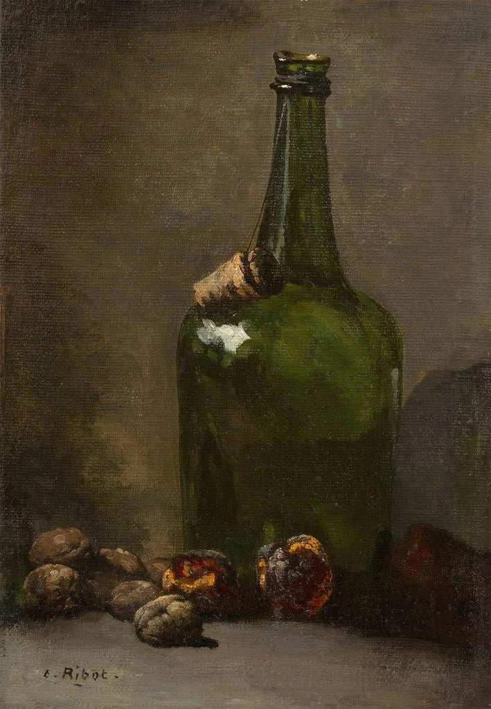 "La bottiglia piena" è un'opera che invita alla contemplazione della bellezza degli oggetti quotidiani. La composizione, centrata su una bottiglia accuratamente dipinta, mette in risalto sfumature di colori che giocano con la luce e le ombre. La tecnica di Ribot, che unisce realismo e impressionismo, conferisce a questo oggetto una presenza quasi viva. L'atmosfera della tela è allo stesso tempo rilassante e intrigante, stimolando lo spettatore a interrogarsi sul significato di questo semplice oggetto. Ogni dettaglio, dai riflessi sul vetro alle texture delle superfici, testimonia una padronanza tecnica impressionante.