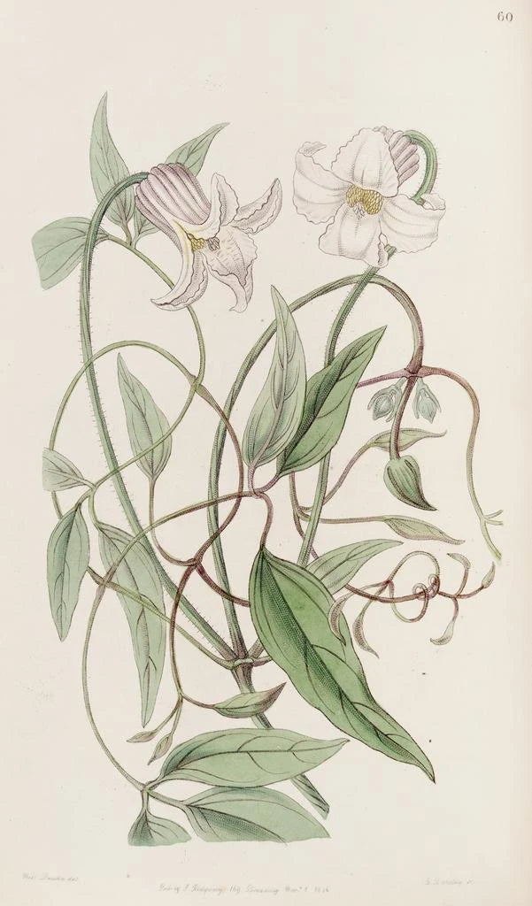 La clematide a fiori arricciati, opera di Sydenham Edwards, è una celebrazione della natura attraverso una tavolozza vibrante e dettagli minuziosi. I petali delicati, con contorni ondulati, sembrano animarsi sotto la luce, creando un'atmosfera quasi fiabesca. La tecnica dell’acquarello, usata con maestria, permette di catturare la trasparenza e la leggerezza dei fiori, mentre lo sfondo subtilmente sfumato mette in risalto la bellezza di questa pianta rampicante. Ogni colpo di pennello racconta una storia, invitando lo spettatore a immergersi in un mondo dove botanica e arte si incontrano armoniosamente.