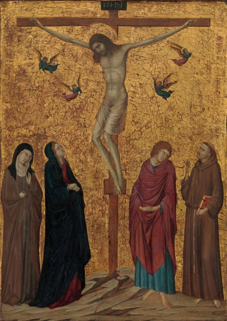 La Crucifixion di Ugolino da Siena è un'opera che cattura l'essenza stessa della sofferenza e della redenzione. In questa rappresentazione toccante, i colori scuri e terrosi predominano, creando un'atmosfera di gravità e raccoglimento. La composizione, centrata sul Cristo crocifisso, è circondata da figure della Vergine Maria e di San Giovanni, le loro espressioni intrise di dolore e compassione. La tecnica dell'artista, mescolando tempera e doratura, conferisce a questa tela una profondità spirituale, invitando lo spettatore a una contemplazione meditativa sul sacrificio e sulla fede.