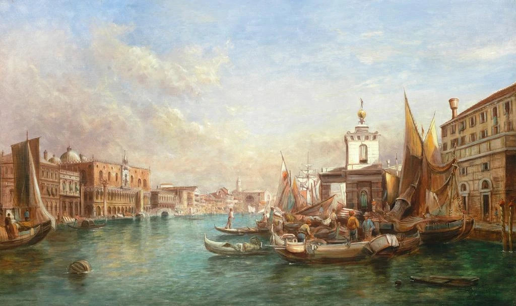 La Dogana, opera emblematica di Alfred Pollentine, trasporta lo spettatore nel cuore di Venezia, dove l'animazione dei moli e la bellezza degli edifici si mescolano armoniosamente. I colori vivaci, che vanno dai blu profondi agli ocra caldi, creano un'atmosfera vivace e accogliente. La tecnica dell'artista, che utilizza tocchi di pennello delicati e dettagli minuziosi, dà vita a questa scena marittima. Le vele delle barche si ergono fieramente, mentre i passanti si affaccendano, tutti immersi nella quotidianità di una città dove il commercio e l'arte si incontrano.