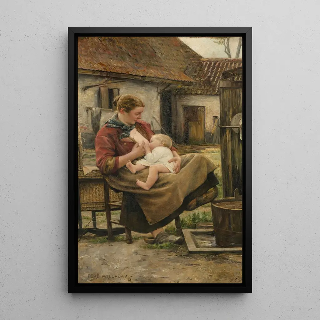 In questa stampa d'arte di La giovane mamma, Ferdinand Willaert cattura un momento intimo tra una madre e il suo bambino. La composizione si distingue per colori morbidi e caldi, creando un'atmosfera di serenità e protezione. I dettagli minuziosi del volto della madre, così come la delicatezza dei drappeggi, testimoniano una notevole maestria tecnica. La luce soffusa che illumina la scena accentua la tenerezza di questo legame materno, invitando lo spettatore a percepire l'emozione palpabile che emana da quest'opera.
