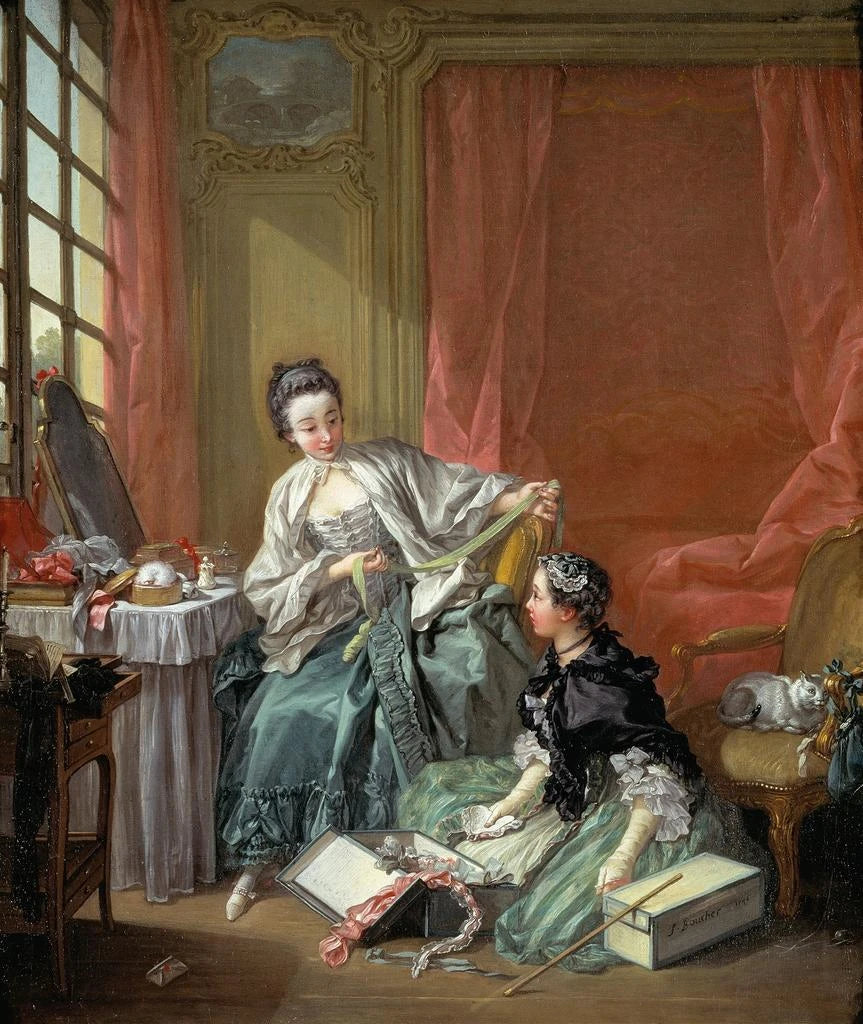 François Boucher, nato nel 1703, è uno dei pittori più emblematici del rococò francese. La sua carriera, costellata di successi, lo colloca al centro della vita artistica del suo tempo. In qualità di pittore di corte, ha saputo catturare l’essenza del gusto aristocratico, influenzando non solo i suoi contemporanei ma anche le generazioni future. Il suo stile, caratterizzato da una sensualità e una leggerezza senza pari, ha aperto la strada a numerosi artisti, ponendo le basi di un’estetica che perdurerà oltre la sua epoca. "La modista" si inserisce in questa linea, illustrando le preoccupazioni e le aspirazioni di una società in cerca di